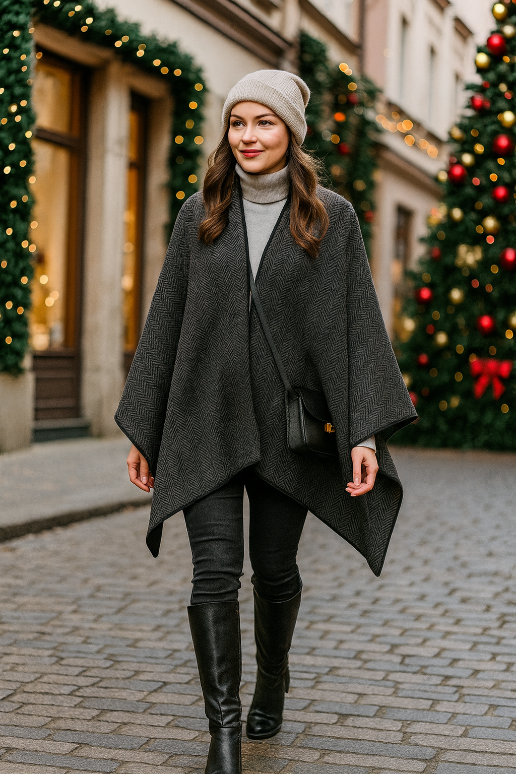 Beige Wrapped Poncho with Red and Grey Stripes
